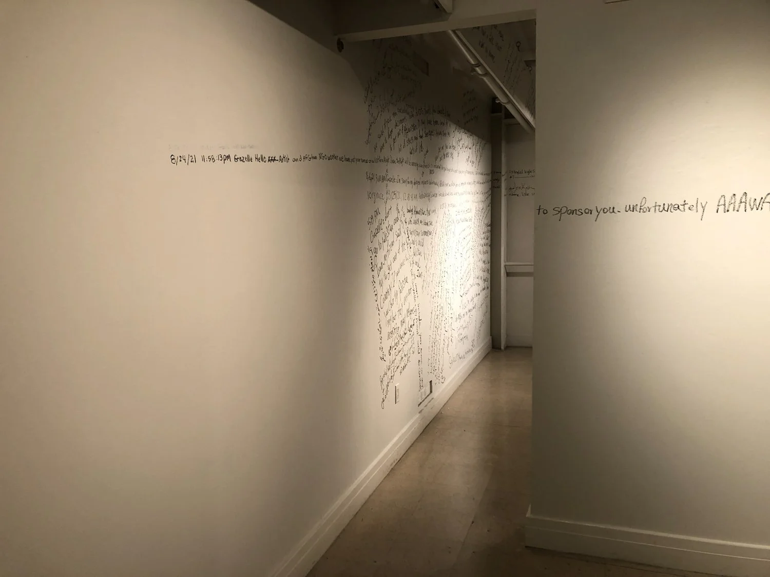 Text message transcripts between myself and the artist are written on the gallery walls, but will be erased at the end of the exhibition, reflecting on the invisible labor of so many in the Afghan diaspora who have been working tirelessly to evacuate at-risk Afghans in spite of a negligent and purposely inaccessible state apparatus, illuminating the mundane and tedious brutalities of the US immigration system.